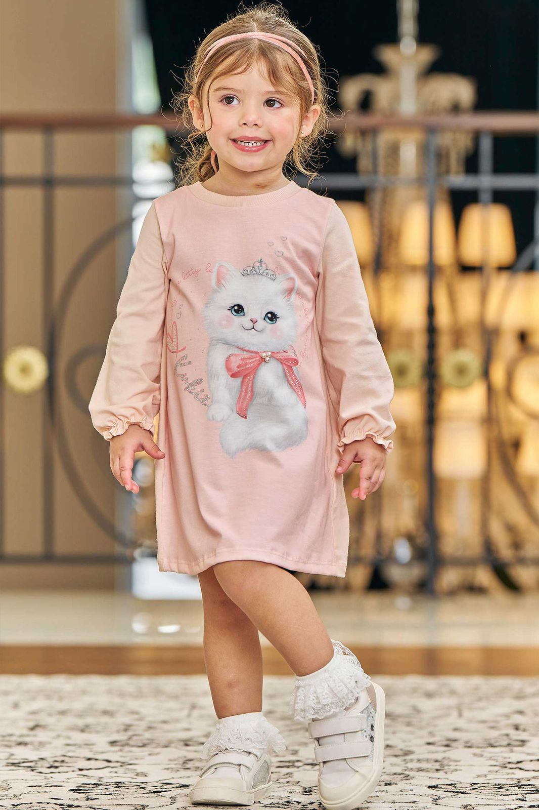 Vestido em cotton Bebê Menina Kukiê Este vestido encantador para menina bebê é a escolha perfeita para quem busca unir conforto, sofisticação e muita fofura em um único look. Confeccionado em cotton de alta qualidade, o vestido oferece a suavidade e o frescor que a pele delicada da sua pequena merece. A estampa de gatinha princesa, combinada com as aplicações de pérolas e strass, cria uma composição única e mágica, ideal para ocasiões especiais como festas, aniversários ou até um ensaio fotográfico. Combine com sapatinhos delicados em cores claras para deixar o look ainda mais encantador.