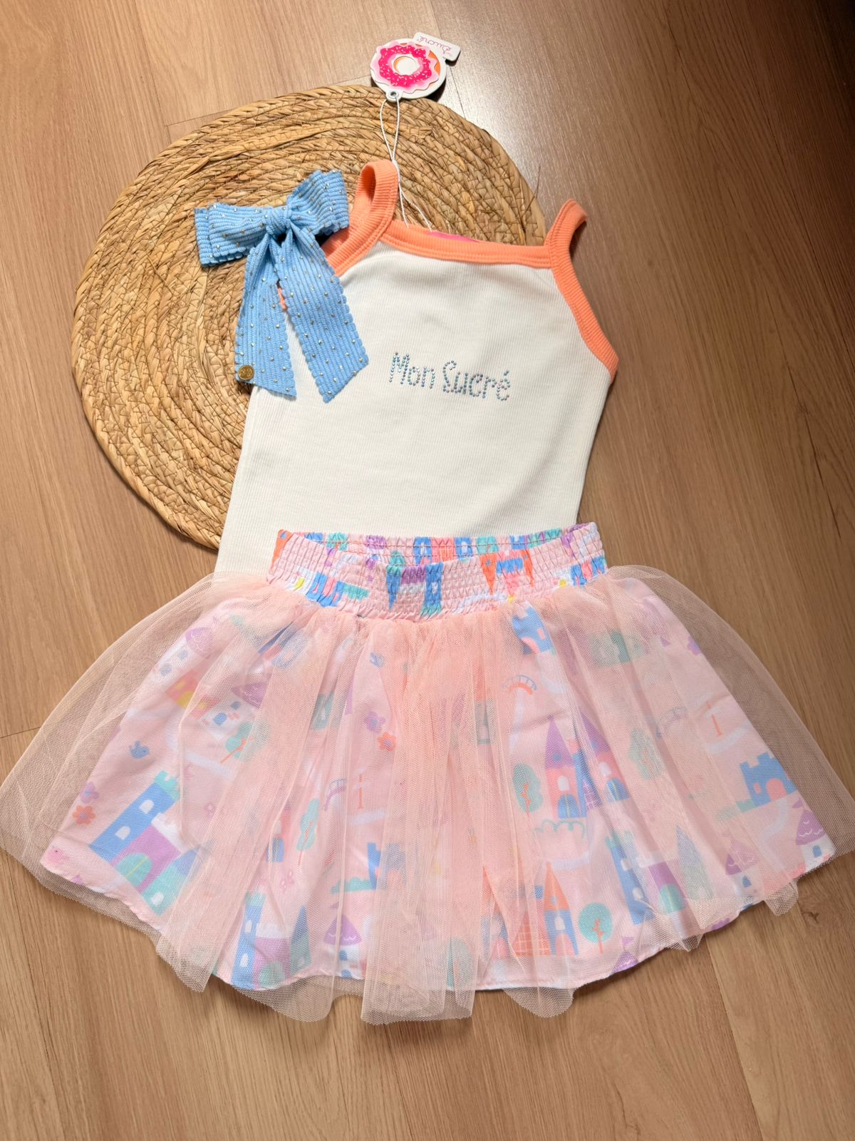 O conjunto infantil Mon Sucré combina delicadeza e diversão em um visual encantador. A regata canelada com alças finas traz o nome da marca bordado com brilho sutil, enquanto a saia com estampa colorida e sobreposição em tule adiciona leveza e movimento. Com cós elástico confortável, é perfeito para criar produções cheias de charme para qualquer ocasião.